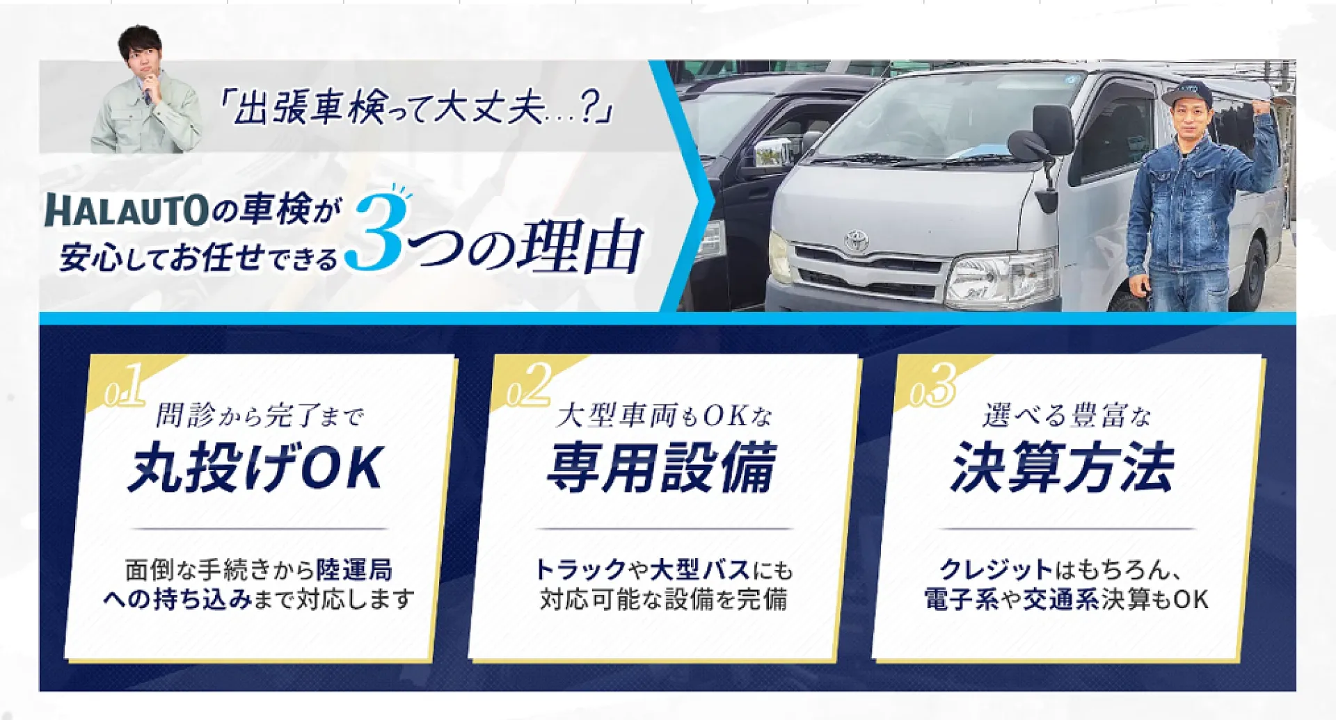 ハルオートは高性能診断機を含め、専用設備が充実しているため、大型車両の車検もお任せいただけます。もちろん、設備だけでなく技術にも自信あり。経験豊富なプロの目と専用設備を駆使し、見逃しがちな細部までしっかりチェックいたします。